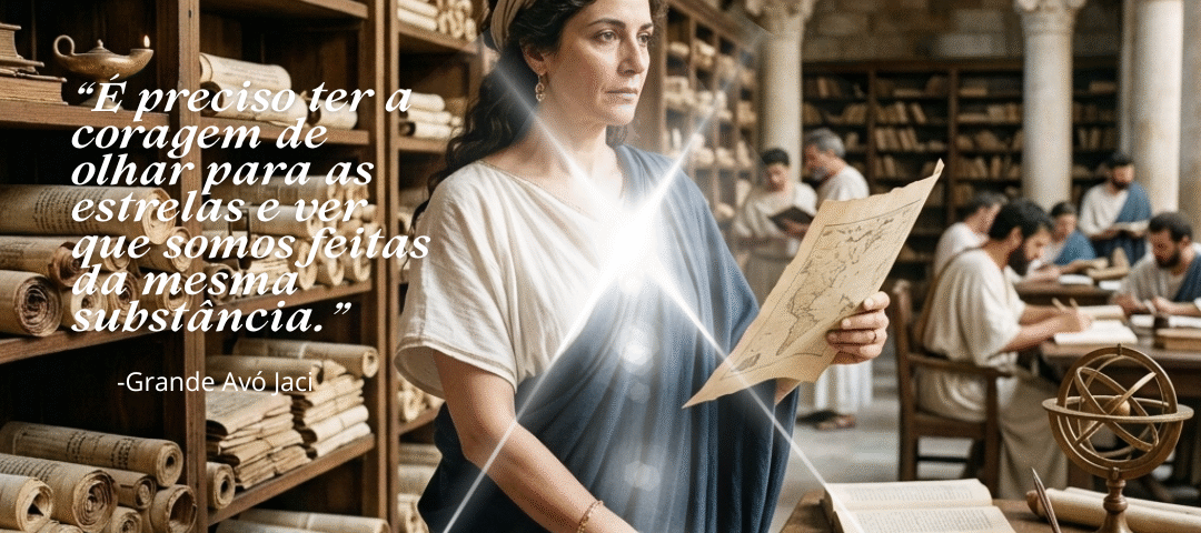 Nossa “biblioteca” não é de pergaminhos – é de consciência, de sabedoria feminina prática, de conexão com o sagrado. E assim como a biblioteca física foi queimada, nós reconhecemos, sabemos que a verdadeira biblioteca é interna.