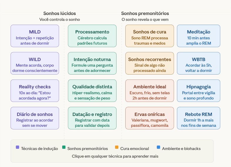 O sonho lúcido é quando você percebe, dentro do sonho, que está sonhando — e pode direcioná-lo conscientemente. Pesquisas do Instituto de Psicofisiologia de Frankfurt mostram que praticantes regulares conseguem induzir lucidez em até 70% das noites com técnicas específicas.