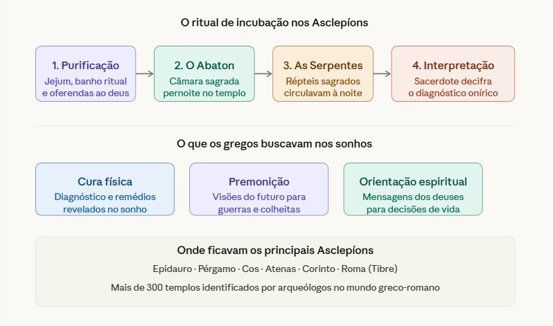 Eram templos sagrados dedicados a Asclépio, o deus da cura, espalhados por toda a Grécia Antiga. O mais famoso ficava em Epidauro. Mas havia dezenas deles. E todos tinham um propósito central: usar o sonho como medicina.